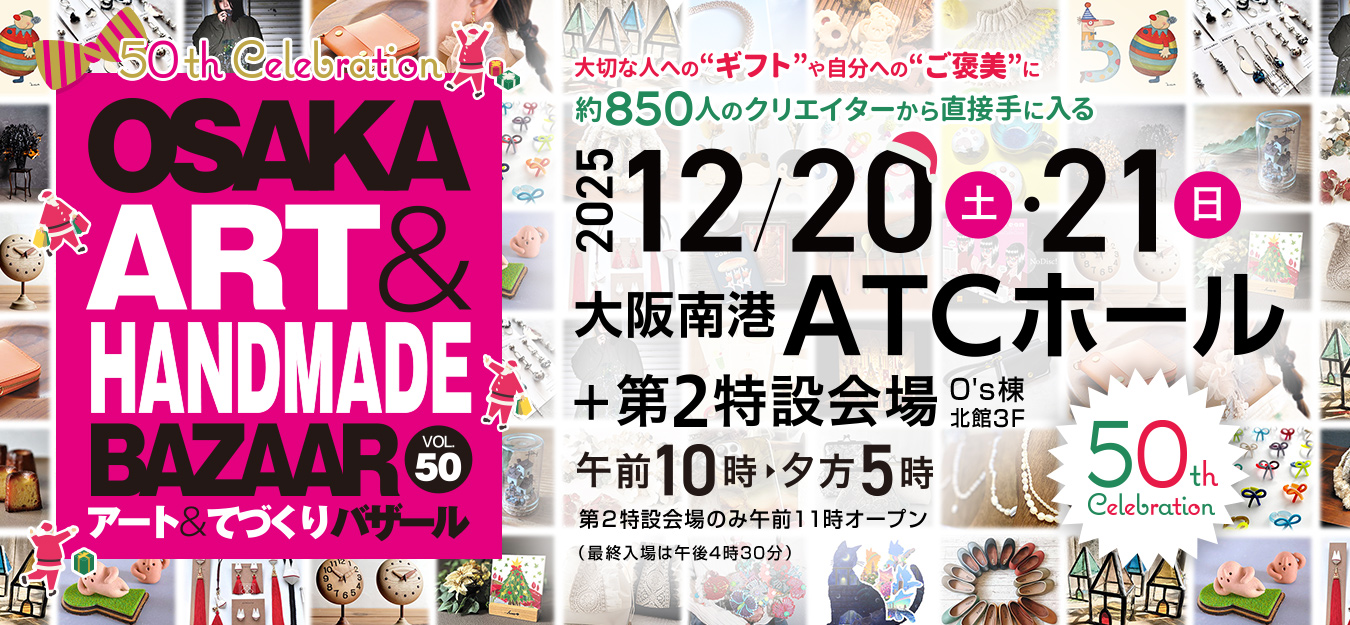 数多くのハンドメイド作家・アーティストがオリジナル作品を展示、販売する関西最大級のアートイベント。イラスト、アクセサリー、陶芸、木工、クラフト…様々なジャンルの作品が一堂に集まります。